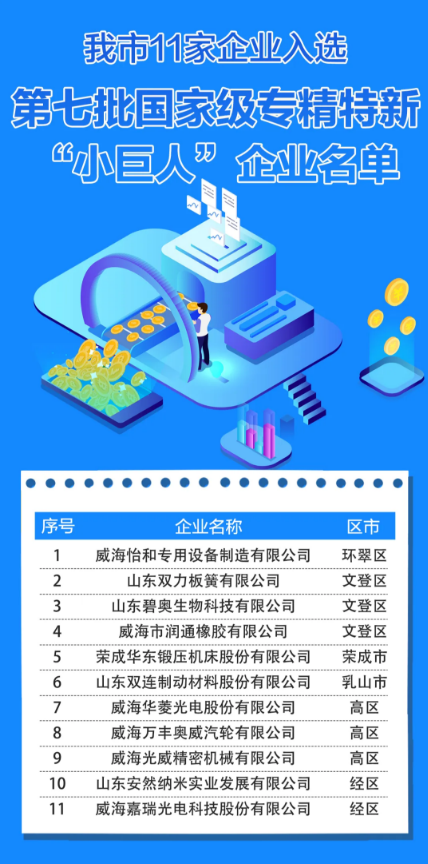 近日,工业和信息化部公布第七批国家级专精特新“小巨人”企业名单,我市华东锻压、万丰奥威等11家企业成功入选。截至目前我市已累计培育国家级专精特新“小巨人”企业65家,占规上工业企业比重达4.6%,位居全省前列。